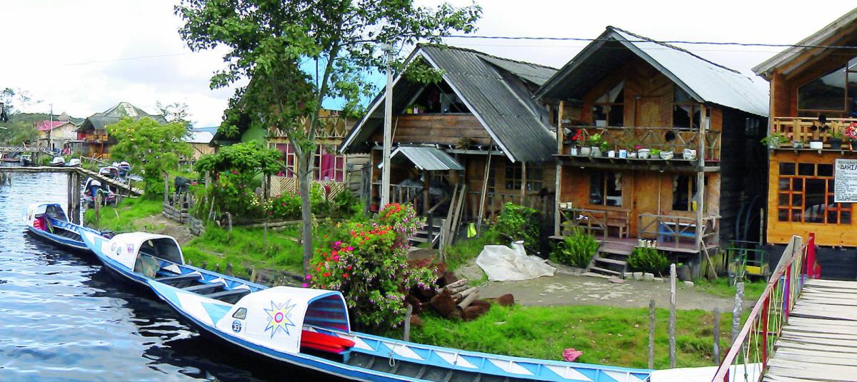 El principal acceso turístico a la laguna es el embarcadero de El Encano, conocido como “El Puerto” o “la pequeña Venecia campestre”, un caserío de casas de madera y chalets de estilo alpino construidos a la orilla de los canales y brazos de la laguna. Desde allí salen lanchas a motor que realizan recorridos por la laguna, visitas a la Isla La Corota y a los humedales de Santa Lucía, donde se pueden observar frailejones y vegetación de páramo en pequeñas caminatas guiadas. El Encano y sus alrededores cuentan con muelles, restaurantes típicos y alojamientos rurales como hostales y hoteles tipo cabaña, muchos de ellos con arquitectura en madera y techos inclinados, que recuerdan paisajes europeos de montaña pero con identidad nariñense.