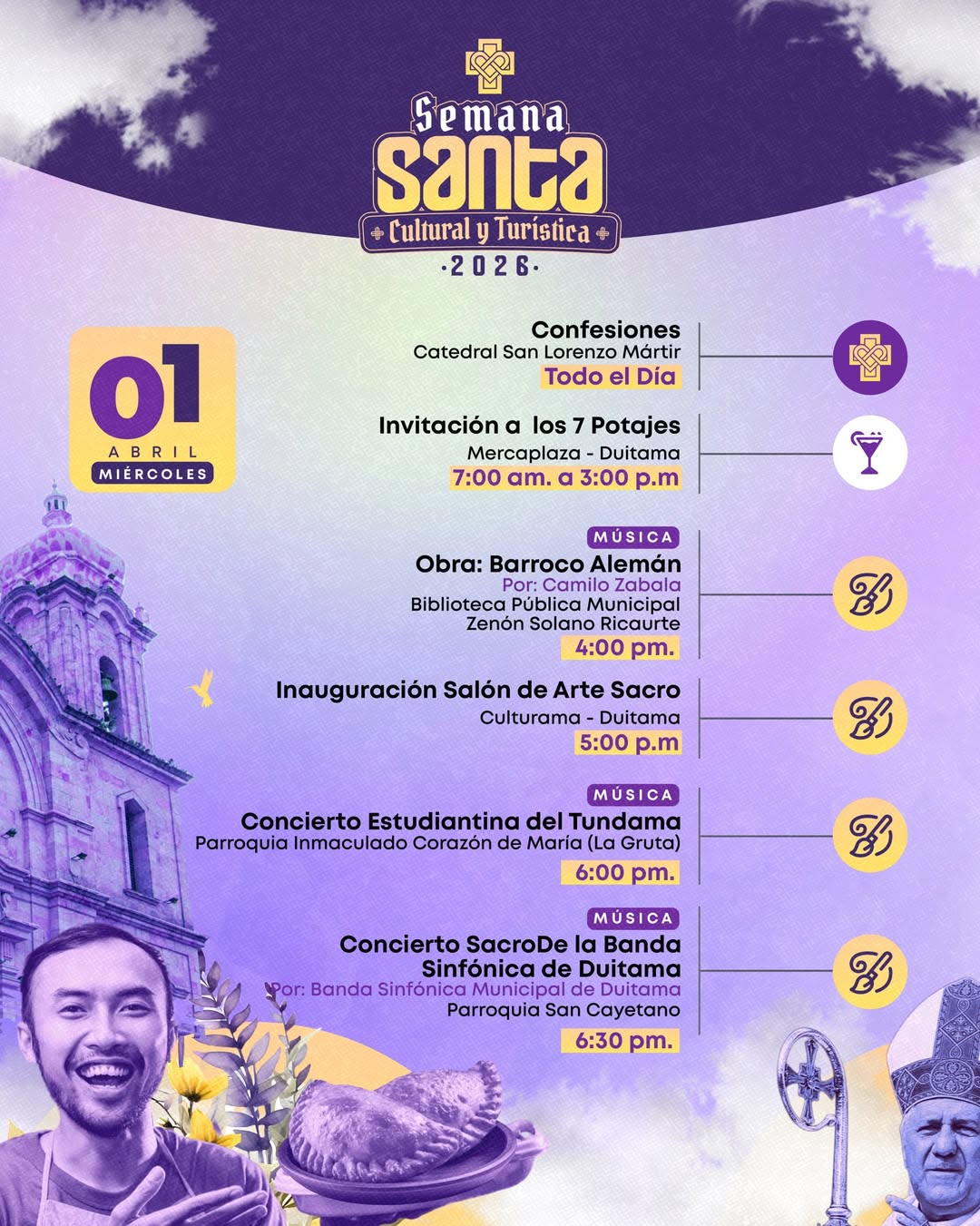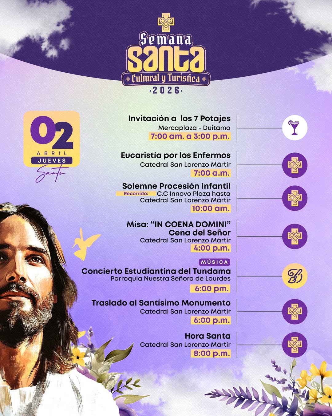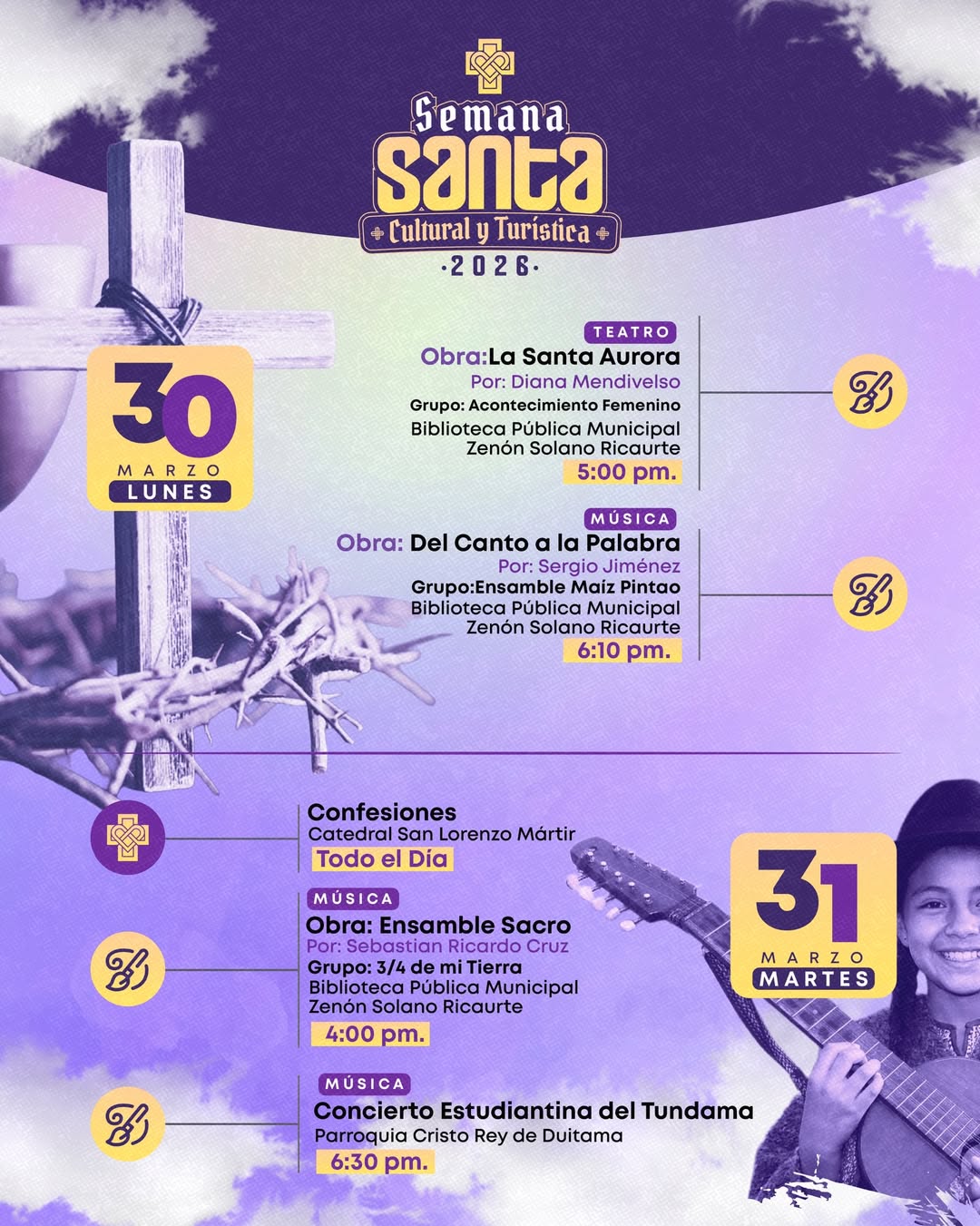 Semana Santa Cultural y Turística 2026 en Duitama es una celebración que une la fe, la tradición y la identidad cultural de la ciudad en una programación especial para propios y visitantes. Del 29 de marzo al 5 de abril, Duitama se convierte en un destino lleno de espiritualidad, arte, música, procesiones, actividades culturales y experiencias turísticas que exaltan el valor de la Semana Santa como una manifestación de devoción y patrimonio.