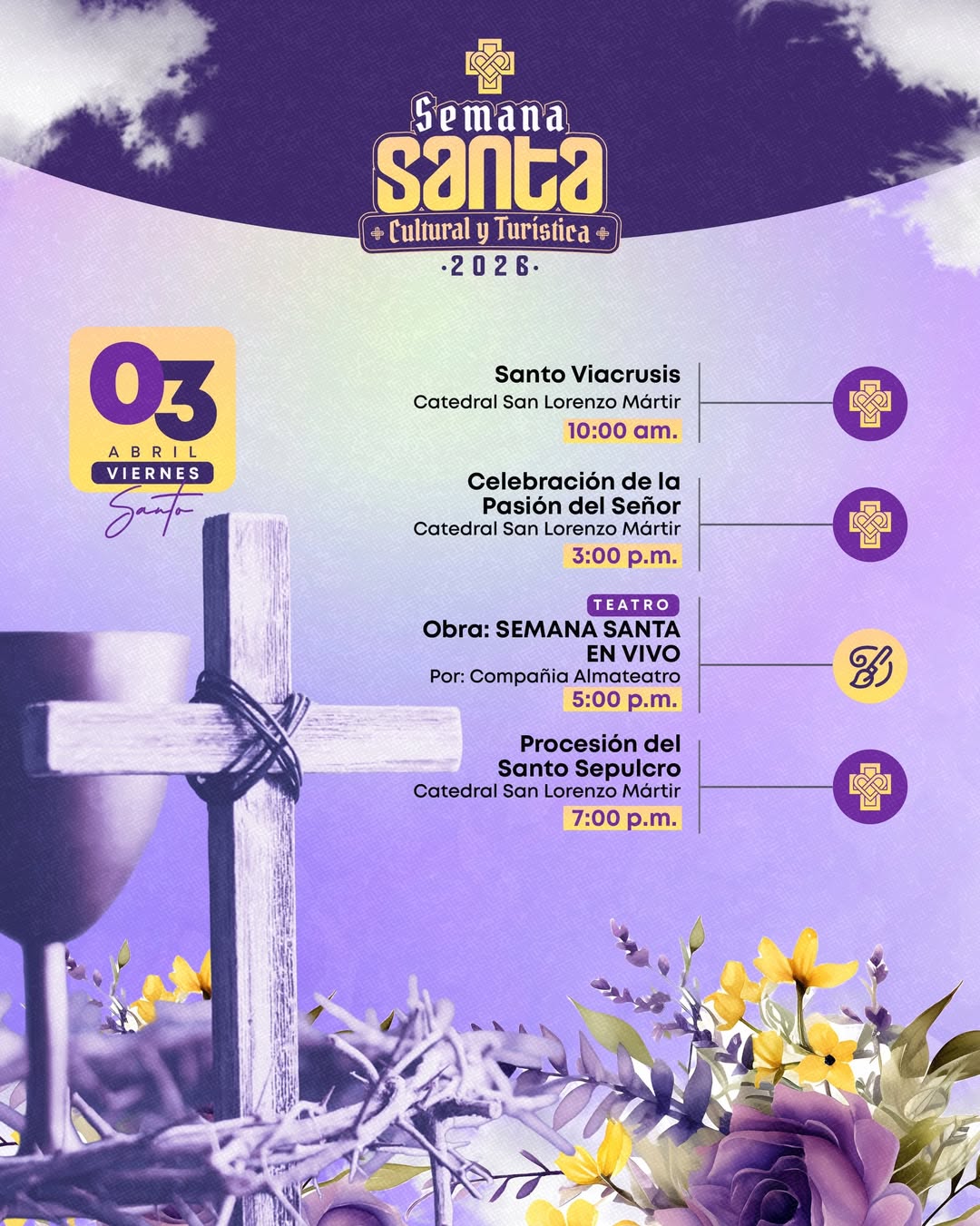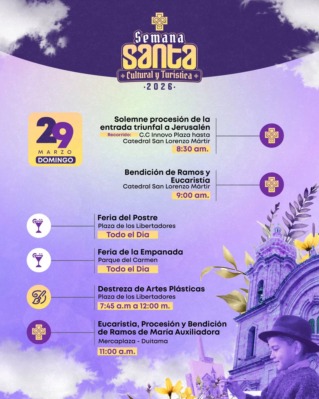 Durante estos días, la ciudad ofrecerá momentos emblemáticos como la solemne procesión de la entrada triunfal a Jerusalén, la bendición de ramos y eucaristías, además de ferias gastronómicas como la Feria del Postre y la Feria de la Empanada, junto con espacios de destreza de artes plásticas y otras actividades que enriquecen la agenda religiosa y cultural. Cada evento fue pensado para vivir la Semana Santa con fervor, tradición y encuentro comunitario.