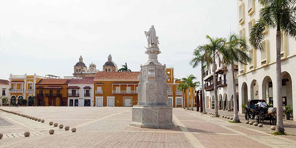 En su centro se encuentra la estatua ecuestre de Cristóbal Colón, inaugurada en 1894 para conmemorar el cuarto centenario del descubrimiento de América, obra del escultor italiano Filippo Albacini que representa al navegante genovés señalando hacia el horizonte. La plaza está rodeada por algunos de los edificios más señoriales de Cartagena: el Palacio de la Inquisición (hoy Museo Histórico de Cartagena), el Palacio Consistorial (Alcaldía Mayor), la Casa del Marqués del Premio Real y la Casa de la Aduana, que alberga oficinas administrativas. Estas construcciones del siglo XVIII, de estilo barroco y neoclásico, conservan balcones de hierro forjado, portales abovedados y fachadas pintadas en colores pastel que dan al conjunto un carácter elegante y monumental.