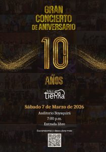 Prepárate para vivir una noche especial donde la tradición, el talento y la pasión por la música se unen para celebrar una década de historia. El Gran Concierto de Aniversario reunirá lo mejor del repertorio y la trayectoria de 3/4 de Tierra en un espectáculo lleno de emoción, cultura y sonidos que representan nuestra identidad.