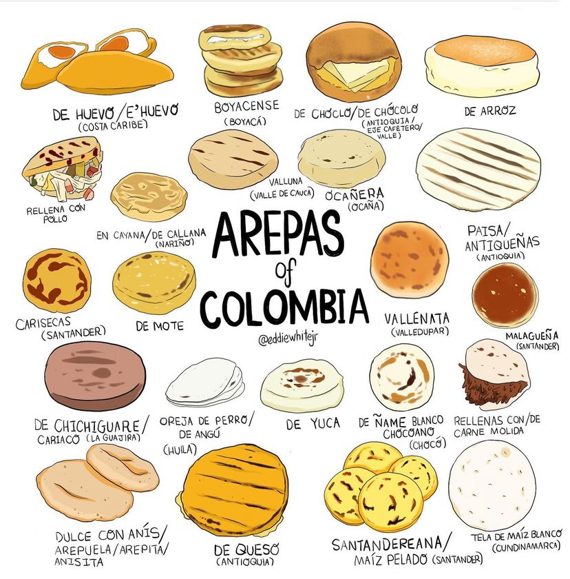 Arepa paisa: Blanca, gruesa y de maíz peto — la arepa de Antioquia y el Eje Cafetero. Se come con mantequilla, queso o hogao.